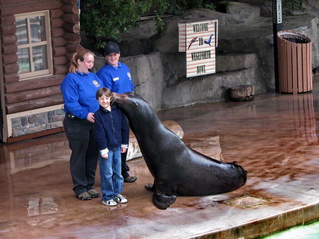 Ce jeune volontaire qui a fait travailler l'otarie en reçoit un baiser/This young volunteer who played with the sea lion gets a wet kiss.