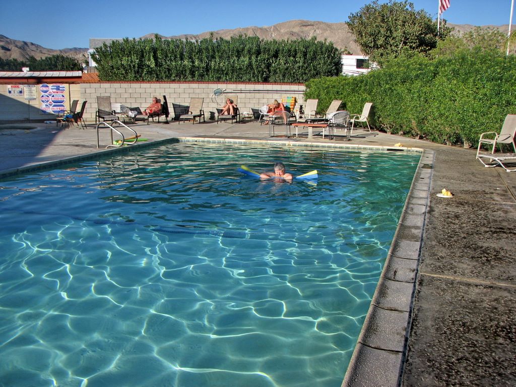 Notre camping de Palm Springs a une belle piscine alimentée par des sources thermales/ Our Palm Springs campground has a nice pool fed by hot springs